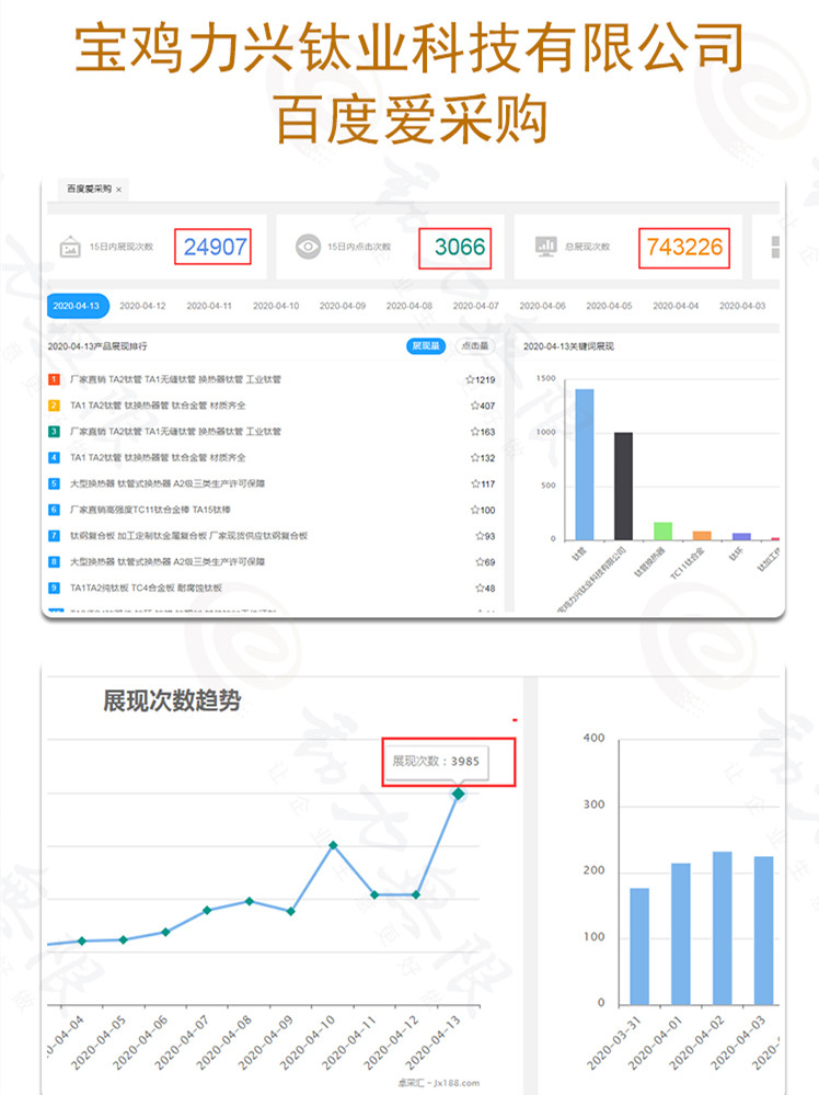 寶雞力興鈦業(yè)科技有限公司,這一個月以來,百度愛采購的總展現(xiàn)次數(shù)高達743226次,點擊量提高的同時,詢盤量也得到明顯增加,更多意向客戶成交促進受益。