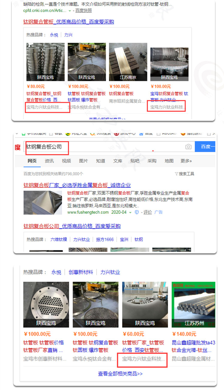 近15天內(nèi),曝光度為24907次,點擊數(shù)達到3066次;在關(guān)鍵詞搜索中,寶雞力興鈦業(yè)科技有限公司的“鈦合金梯子”、“TA2工業(yè)鈦板”、“鈦鋼復(fù)合管板”、“大型鈦換熱器”等,排在*位。