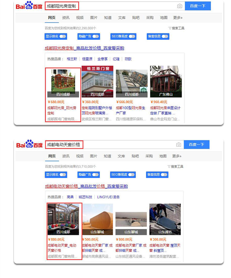 在關(guān)鍵詞搜索中,成都暉鴻門窗有限公司的“成都陽光房定制”、“成都電動天窗價格”,排在*位;“成都斷橋鋁門窗”排在第二位;“成都別墅銅門”、“成都鋁包木門窗排在第三名”。