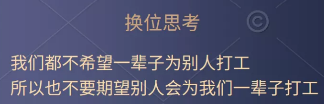 很多中小民營企業(yè),往往是老板一股獨大,不愿意與別人合作,也不愿與別人分享,只是希望員工為自己打工,還希望員工一輩子死心塌地的為企業(yè)付出,有的老板總和我抱怨為什么人才培養(yǎng)好了人就跑了,我會問他:“你當(dāng)時為什么要從別人家出來自己創(chuàng)業(yè)?”當(dāng)我們都不希望一輩子為別人打工的時候,我們也不要期望別人會為我們一輩子打工,換位思考我們往往會找到問題的答案。