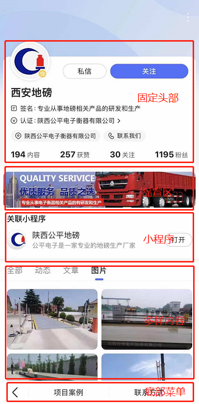 企業百家號主頁分5大模塊:固定頭部、品宣區、小程序、多樣內容、底部菜單。