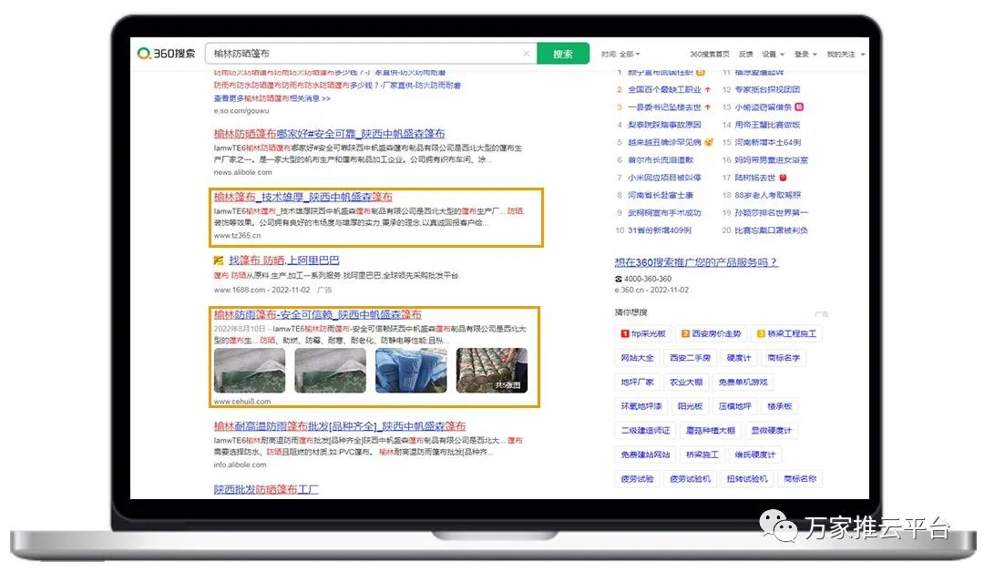 >>>B2B商盟:銅川篷布價位、榆林防曬篷布等關鍵詞均在360搜索引擎平臺首頁展現。